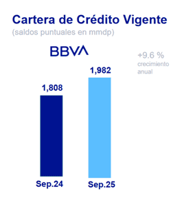 Bajo la denominación de BBVA México se refiere a Grupo Financiero BBVA México, S.A. de C.V. (GFBM) utilizadas en esta nota, se presentan los datos correspondientes al resultado local de la institución financiera. Los criterios contables empleados bajo las Normas y Criterios de Contabilidad Local establecidos por la CNBV han sido modificados a partir de enero de 2022. Los comentarios sobre la actividad crediticia utilizan cifras internas de gestión, como la segmentación de la cartera empresarial, que también pueden diferir de la información publicada por CNBV. Todas las cifras contenidas en el presente documento están expresadas en millones de pesos nominales y se comentan las variaciones anuales (septiembre de 2025 contra septiembre de 2024).
