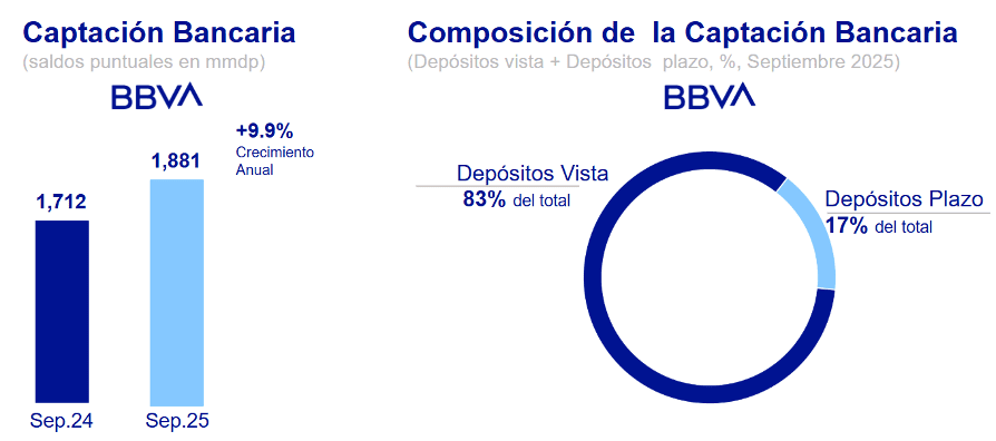Al cierre de septiembre de 2025, los recursos totales depositados por clientes de BBVA México alcanzaron un total de 3.0 billones de pesos, lo que representa un crecimiento anual del 12.2%. Entre la captación vista y ahorro sumaron 1.6 billones de pesos, con un incremento del 8.7%. La captación a plazo totalizó 320,000 millones de pesos, con un avance del 16.0%, mientras que los recursos en sociedades de inversión se ubicaron en 1.1 billones de pesos, 16.2% más que en el mismo periodo del año anterior.
