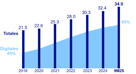 Durante los primeros nueve meses de 2025, el banco alcanzó una base total de 34 millones de clientes, de los cuales el 80% son digitales, reflejando el papel estratégico de la digitalización en la expansión de los servicios financieros. Tan solo la app BBVA Mx sumó 27 millones de usuarios, incorporando 2.9 millones de nuevos clientes digitales en lo que va del año.