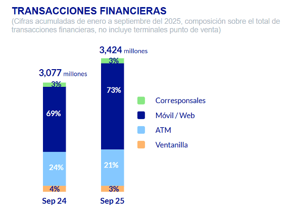 En el segmento hipotecario, se formalizaron más de 26 mil nuevos créditos para adquisición de vivienda, y se llegó a un total de 355 mil hogares financiados. El segmento automotriz registró la apertura de 113 mil nuevos financiamientos, alcanzando un total de 423 mil créditos en este rubro. Con 12.0 millones de acreditados en total, el banco otorgó 4.4 millones de nuevos créditos a familias durante los primeros nueve meses de 2025.