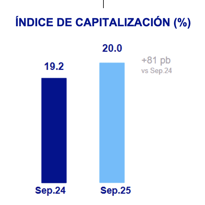 A septiembre de 2025, el índice de capital total se ubicó en 20.0%, cubriendo holgadamente con el requerimiento mínimo regulatorio.