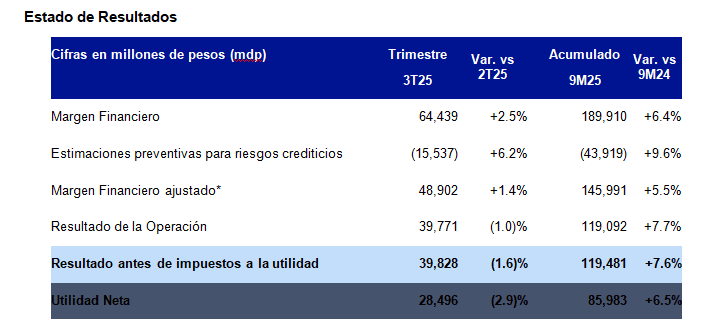 La institución reportó una utilidad neta de 85,983 millones de pesos en los primeros nueve meses de 2025, con un crecimiento anual del 6.5%.