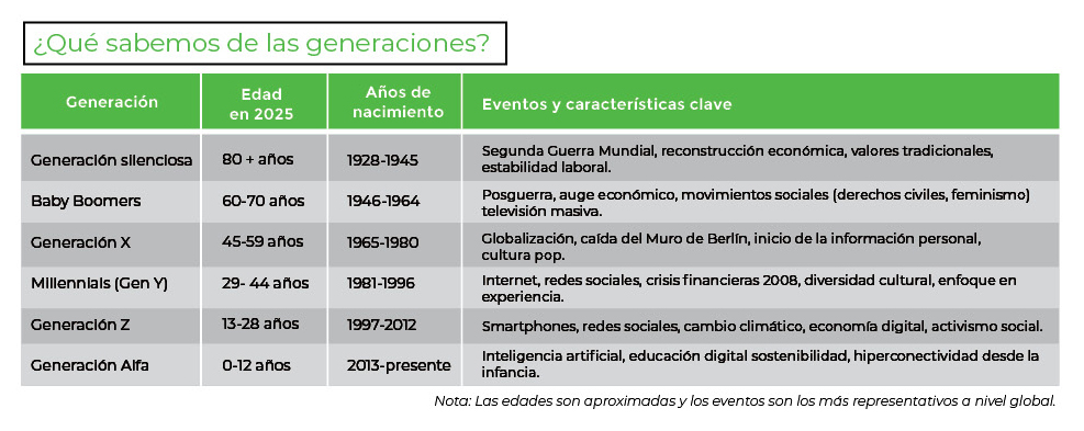 Hoy conviven en las organizaciones algunos integrantes de la generación Silent, Baby Boomers, Generación X, Millennials, Generación Z e incluso los primeros representantes de la Generación Alfa. Este fenómeno, lejos de ser una complicación, representa una oportunidad estratégica para impulsar la innovación, la resiliencia y la competitividad de negocio. Por lo que el liderazgo, por tanto, debe ser adaptable y tener la capacidad de conectar con e inspirar a personas que tienen diferentes perspectivas del mundo y la forma en que les gustaría que fueran las cosas en el trabajo.